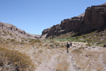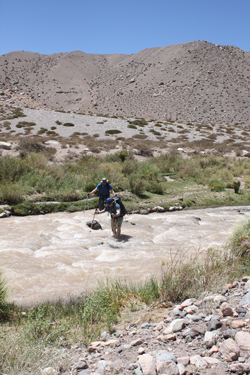 The Approach Camp had fresh water and we dropped our packs and re-filled our bottles right from the resurgences that fed a number of six inch wide and one foot deep water courses that lead to the river twenty five yards distant. Soon after we arrived, Multi-Presa arrived and advised that Celeste and Manuel were en route from the base camp with a group of four French Canadians who were outbound having climbed from the Pirca de Polacos base camp over the past week. Within minutes Celeste and Manuel arrived and we started to get to know the folks we would be working with over the next ten days or so as we took our turn to score a peak in the Ramada Range. After a bit, the Canadians appeared, having had a very long trip down valley, a bit over 8 hours from the base camp. They had managed to cut the five river crossings down to two but in doing so had to fight the occasional lack of trail and topography that otherwise forced most travelers to make the requisite crossings.