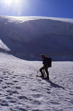 We ascended dodging their dinner place size missiles and keeping our line offset to avoid a re-enactment of the Mount Hood scenario where the sliders took everyone below them for a ride. With steady effort we crossed over the break of the slope and were able to climb the lesser angled snow to the intermediate berschrund and the base of the second steep pitch. The group ahead of us still appeared to be doing it the hard way and when we got to the second ‘schrund, we simply laid low until they again cleared the top of the slope. In the mean time, they did manage to send one slab into my shoulder blade and put a ping pong ball size chunk into Gary’s chin but we did manage to avoid the circular saw blades that whizzed by our position, cutting through the air with a wicked buzzing sound. Once the other group cleared, we began our progress anew and found the second slope to be a longer version of the first, blue ice ranging from 45 degrees on average to occaisional rolls upward of 55 to 60 degrees. One tool, two tools, pointing or walking, we all made it up in our own style, continuously protected by well placed ice screws in the event of a gravitational mishap.