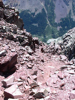 We crossed the creek and climbed up and through the short cliff band that guards the plateau at the base of the red rock glacier below the “sleeping sexton.” Cairns here and there showed a trace across this rocky slope but for the most part we just traversed across the loose talus, aiming for a visible trail at the base of the Bell’s prominent ridge. Once on the trail we moved along the base of the Bell, climbing toward the point on the ridge line where the ridge of a far peak descends to visually intersect the ridge of the Bell. We rounded the corner and entered the green and grassy couloir that would lead us part of the way up the face of the peak. The couloir is refreshingly vegetated and the trail switches back forth as it unceasingly climbs up this gully to the apparent skyline.