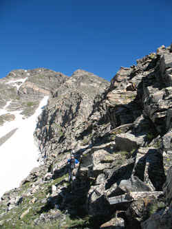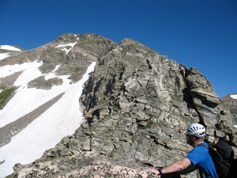 We took a GU and water break for perhaps 15 minutes before saddling up to climb the class 2 slope to a point where the route nearly flattens before the final summit pyramid. We are now in summer trail territory and a clear path led to the summit proper. Another GU stop for a few minutes and the debate of whether to lug the packs to the summit of Parry Peak, three quarters of a mile and more than a few hundred feet of drop and re-climb away. Marmots and the opportunity to side traverse the summit on the return led us to take the packs and gear along for the walk . . to Parry Peak of course. It is never a surprise how easy it is to walk down a mountain slope to the saddle between two peaks and how hard it is to walk up the other side. Why, once you have the first summit in hand, do any of us walk down and then back up, knowing we really have to do it twice, to score a second summit. Are we simply all peak baggers at heart . . . perhaps.