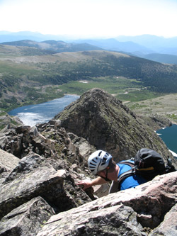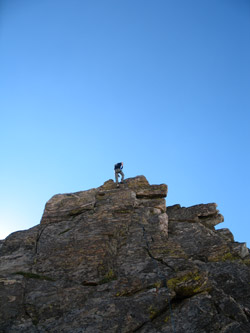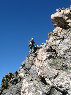 The ridge starts off at a gentle class 3 level of difficulty and then jumps up a notch to class 4 more or less for the rest of the way to the 1/3 point gap. I chose to get right onto the ridge proper and work my way along its sharp crest. Good exposure to the left and right but for me, just very comfortable hand and foot climbing. We ridge climbed to the gap and were met by a good size marmot, who obviously considered this his realm. Funny thing was he did not seem to have a taste for nylon slings as the boulder which is the anchor for the rappel was festooned with not less than ten slings in all of the available colors. Not a one of them chewed. We dropped the packs, un packed the rope and inspected the slings. I am not a fan of using slings found on any peak to form a rappel anchor but there were so damn many of them . . . could they all fail?