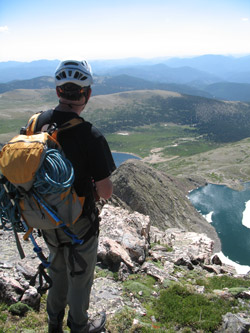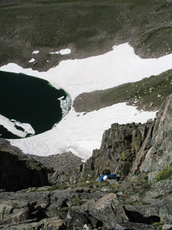 No problem, off to the left is a ledge and after a friction move or two, I was 20 feet up and back on the ridge. G chose another route and a few minutes later joined me on the ridge. I will note that my move was actually in the light realm of class 5 but comfortable for me. G likely kept it to the high end of class 4 . . . but a slip was not an option for either of us as a sliding fall was going to be a fast slide down about 700 feet of snow to the recently thawed lake below. In other words, a slip was not an option that one would walk away from, swim away from perhaps, but not walk for sure.