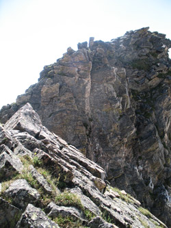 We continued on the ridge, most all class 4 terrain until we reached a minor saddle that lay just before what I think was the real crux of the climb. A sharp jump up in the ridge the necessitates a shift to the left if one wants to avoid dropping down a steep coulir to the right and then climbing up a steep chimney. I opted to skirting to the left for a few yards and then taking a class 4 slab move up to more solid hand and foot action to regain the ridge. This type of ground continued for another half hour of climbing, a good couple of hundred yards before the route abruptly mellows out at a red dirt saddle. The real climbing is over.