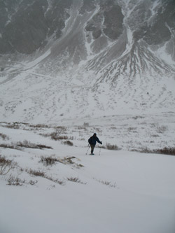 I took the lead down, knowing that our route had taken the edge of the big snowfield down to the big cairn marking the Torreys saddle traverse trail . . . a sure connection even in the lousy visibility. We hit the cairn and made good time down the snow and ice covered trail. We were hungry but I had little intent to stop before we were at the bare ground opposite the Kelso saddle. I wanted a low wind and warm temperature stop in lieu of some higher, more miserable venue. We ate a bit and then were off to the tent, stopping only to put the snowshoes back on about 1/4 mile beyond the lunch stop. We had started breaking through the crust here and there, and what the heck . . .why bust your hump if you don't have to.