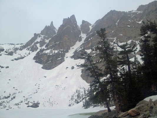We hefted the packs, made a bit heavier as we all lashed snowshoes to be prepared for the hike down after the climb. We figured the route to the climb would be a solid boot pack but that the hike from tree line to Bear Lake would be through the trees and likely involve a lot of warm snow. The snow at Bear Lake was still deep so we know that coming off Flattop would be a pain in the butt, a pain that none of us looked forward to. We found what we expected, a solid boot packed trail from the parking lot to Nymph lake, to Dream Lake and to Emerald Lake. The lakes were definitely no crossing zones and we traversed alongside of all three. I did manage to probe Emerald only to punch through the edge before jumping back fast enough to keep the water out of my boot.
