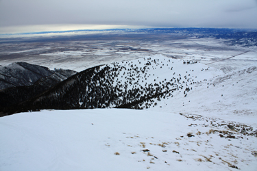 The only problem was this was not the summit . . . no the summit was another mile beyond where we were and reaching it would require us to lose a couple hundred feet to move upward again on the final slopes. It was 3 p.m., the wind had just started, the sun would be down by 6 p.m. . . . making the crossing to the true summit and back would take no less than two hours. It was obvious, we were not going to score Cottonwood Peak on this outing. The was no debate, no waffling, no whining, we just looked back toward the valley behind us and started down.