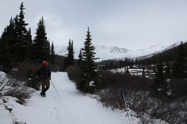 The trip started on Friday night with a leisurely drive to the Super 8 in Leadville. While we could have opted to camp, we did not expect to arrive until after 9 p.m. and neither of us really wanted to find and set up camp in the dark and snow, and then get up at zero dark 30 to start climbing. Instead we decided to rough it in Leadville proper and then hit the Halfmoon trail head the next morning at a reasonable hour. The alarm failed to go off but that was OK as we awoke at 6:00 a.m. and there was still no sign of any sunrise through the window. No problem . . . we had decided the night before to aim for a 7:00 a.m. departure from the trail head, figuring that the approach and retreat on an old mining road would negate any need to absolutely be back at the truck by dark.