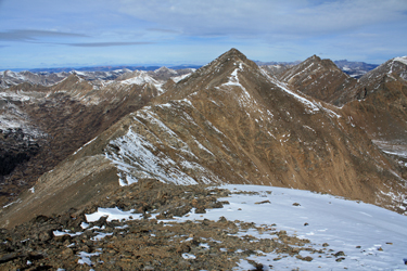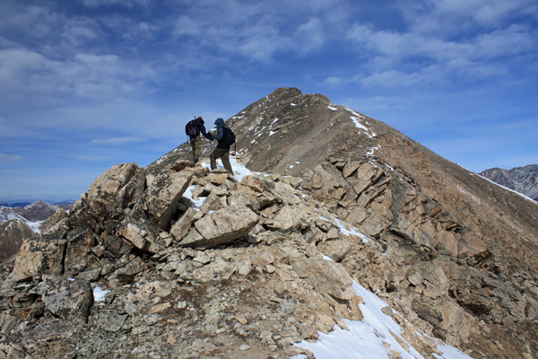 The mittens and heavy gloves came out and the hoods and wind stopper hats were broken out for the traverse. The route was a range of class 2 terrain, broken here and there by a hand and foot scramble up a rocky hump. Once we passed the saddle, the uphill movement started to warm the hands again as the terrain treated us to climbs along the steeper eastern side of the ridge. For me, the terrain was a test ground for the healing ankle, broken 12 weeks before in the San Juans. The range of motion is not what it wa so I took a bit of extra time over the more rough terrain, paying a bit more attention to the foot placement than I once did, where hopping talus was an effortless affair.