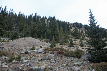 The creek offered a dry rock crossing after which we headed for a muck pile on the premise that there was a mine up high on the flank and a muck pile down low. Even though the Champion Mine was serviced by an aerial tramway, I hoped that some reason caused someone to cut a trail down to his side of the mountain to gain the Independence Pass track of years gone by. I also kind of spotted a squiggle on the map indicating a number of old road beds. Well . . . we did not intercept the road of my hope and instead cut a strong trail a couple hundred yards directly up through the timber. The trail lead upward and around the end of the mountain to an opening at the base of an inviting gully.