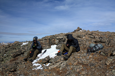 From the Champion Mine, we cut north and passed a few more collapsed adits before simply walking the more sedate slope to the summit proper to join the wind that had allowed us to this point without an interference. That would not be the case from the Champion summit on. The down jackets came out and after having a bite to eat and leaving a worm for Pacha, we were up and on our way across the ridge and saddle to Pt. 13,736. The wind was biting, and cold hands were had by all.