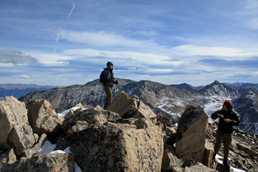 We topped the rocky summit of Pt. 13,736 at about 11:30 a.m. and found shelter from the wind long enough for some gummy bears, Gu and hydration. We discussed the route down and in lieu of taking the northerly ridge of Pt. 13,736, we opted to return to the summit between the Point and Champion, where we spied what looked like a route downward. The traverse back to the saddle was easy, the drop from there was the test to date of the ankle and he psyche. We knew that the visible part of the route would be a mix of scree and smaller talus, mostly likely loose.
