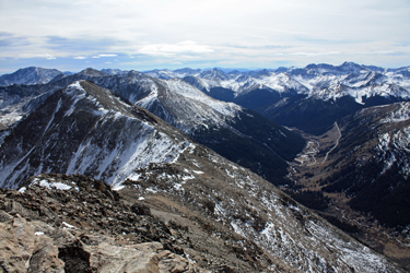 A climb of Mt. Champion and Pt. 13,736 seemed like the perfect way to spend a bluebird day, one of a series that now spanned the later half of October and were expanding into November. We had spent the previous night at the Leadville Super 8 after a great Lomo Saltado meal on the way through Denver and we were ready to climb. But no need to hurry at this time of year, we arrived at the trailhead at 8 a.m. after a stop in town for coffee, hot chocolate and some pastries. No thunderstorms . . . no hurry.