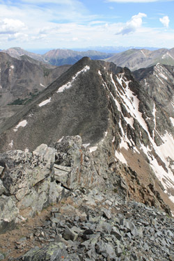 The route from couloir exit is a five minute hand and foot class three scramble to the summit, which is a three way arret of sorts without the usual Sawatch flat spot. We set the packs down and took in the incredible scenery, not only of our lofty perch but also of the surrounding Collegiate Range, the Elks and a touch of San Juans were the visibility allowed. The clouds were starting to build but we'd gotten up the couloir in good time, landing on the summit at 10:20 or so, late by my standards but not inexcusably so. We were ready to move on after about ten minutes and though I did not know the route down to the Ice/North Apostle saddle, I knew that to be the standard route, hence there would be enough foot traffic signs to allow one to pick one's way down the northwest Ridge with little difficulty. However, I say this with 80+ 14'ers under my belt, so what my be an obvious track across rock to me is, quite honestly, an indiscernible pattern to my wife on flat ground.