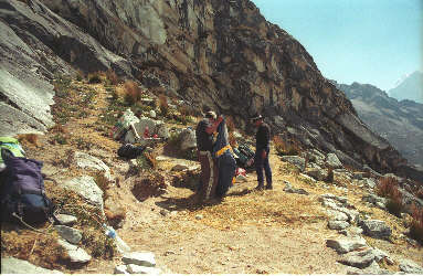 Since we had been up the moraine the day before, we knew what we had coming our way. It promised to be a three-hour slog with no running water and all too many vertical feet with a 40+ pound load. We made the climb to the moraine and moved purposely along its flat top until we reached the drop down and re-climb to take on the remaining and most substantial section. Without a doubt, the lower moraine is a cake walk compared to the verticality of the later portion of the climb. We lugged our loads just about non-stop to the halfway point of the upper steep section before stopping for lunch. . . high clouds were moving in. Wispy lenticular clouds made their way across the sky, higher than the 20k summit of Huandoy across the valley. We knew that lenticular clouds often foretold a change in the weather and Joaquin voiced the same opinion, reinforced by his correlation of the weather and the phase of the moon. The prediction was for a change to the perfect weather so far, a change neither Gary nor I wanted any part of.