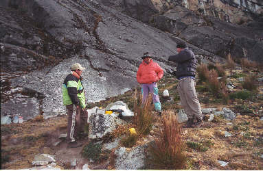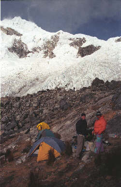 We finished lunch and hefted our loads to make the rest of the climb to the flats of the moraine camp. Joaquin and Elias passed us on the final stretch to claim three flat pads distant enough from the high wall to avoid the rock fall they said was likely in this area. We set up our tents and as we finished, Elias announced the afternoon snack was ready. As we ate, we took in the vista that lay before us. The camp faces north and offers a view ranging from the Huandoys on the western edge to Chacaraju on the eastern edge. In between lies Pisco, and the further distant summits of Artisanraju, Alpa Mayo and Quitaraju. The view as you sit, butt on a warm smooth rock at 16,500 feet, is enough to justify the trip to this point, even if you choose to go no further. Elias served dinner by five and we were soon in the tents trying to regain some of the energy lost to the climb up. We knew that clouds or not, the acclimatization process could not be hurried, therefore our plan was to layover one full day in the moraine camp and let our bodies recover from two consecutive days of lugging loads to the Moraine Camp.