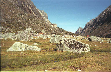 We found the route up the valley to be readily accessible for the pack train and that there appeared to be a flat suitable for camping just below the steep headwall leading to the glacier. Joaquin indicated that when he had climbed the peak before, they had camped at the flat spot but that the glacier looked different from his past ascents and appeared to have both retreated and broken up a bit. We spent a lot of time glassing the potential route up the glacier and felt there and there was a circuitous but viable path through the crevasses to the summit. No telling the condition of the snow bridges or just how large the obvious summit moat was but we had seen enough on the positive side to toss the guidebook aside and take a shot at the summit of Millisraju. Satisfied with our progress, we sat down for lunch before heading back to our camp, about four miles distant, at the base of Alpa Mayo. We left the Sentilo and regained the well-trodden trekking route, traversed along the side slopes above the switchbacks above Quishuar and on back up the hanging valley to our camp. Elias had a late afternoon snack ready and a dinner soon followed. We huddled in the cook tent and discussed our goal to take a shot a Millisraju and the plan for the next day . . . a complete move of the camp to the flat spot below Millisraju’s eastern flank. |